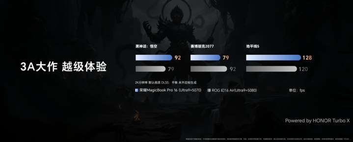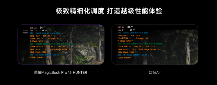 荣耀MagicBook Pro 16 HUNTER版2025拥有智能、高能、狂战三档性能模式可选,在狂战模式下,整机最高可释放150W超强性能。在HONOR Turbo X调校技术加持下,这款笔记本在不少主流3A和网游中实测的游戏帧率都达到行业领先水平,为用户带来更强大和流畅的越级体验。