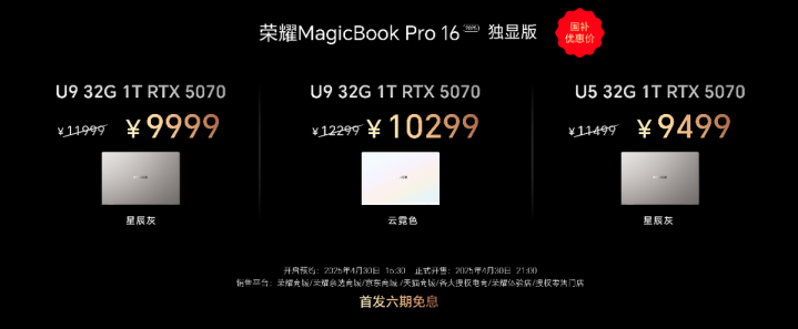 荣耀MagicBook Pro 16 2025提供独显和集显两种配置,满足用户的不同预算需求。其中,搭载RTX 5070独立显卡的荣耀MagicBook Pro 16 HUNTER版2025国补到手价9499元起,4月30日21:00全渠道首销;集显版国补到手价5039.2元起,4月30日15:30全渠道首销,想抢先体验的用户可以抓紧时间入手。